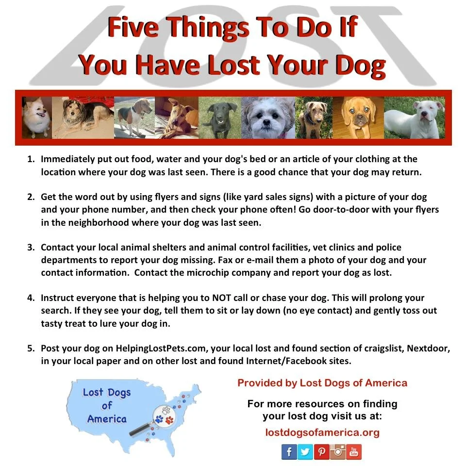 Notify the emergency line ASAP so we can begin the process of a safe return. Include how the animal got lost, where, what time they were lost and closest intersection.