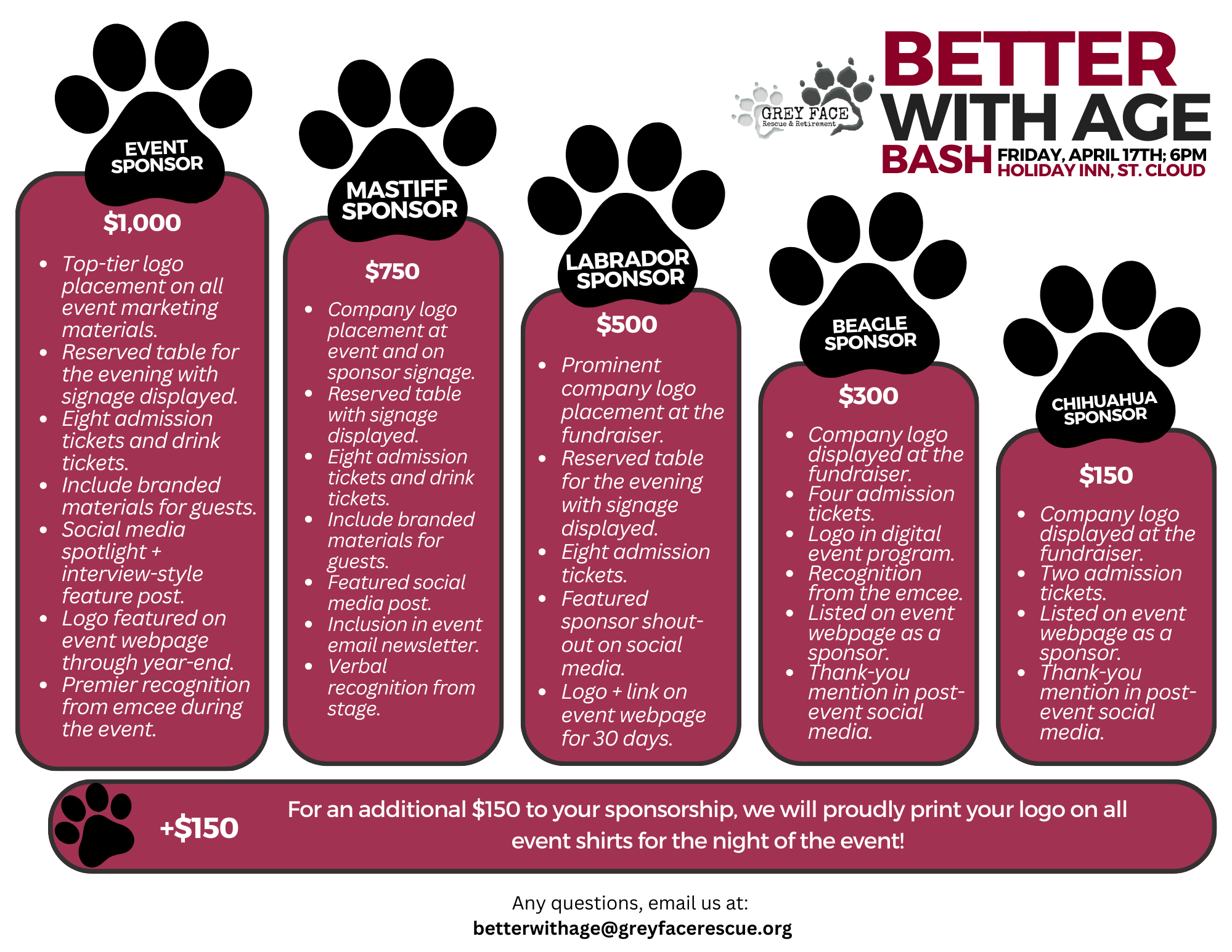 We are excited to offer five sponsorship levels for our 4th Annual Better With Age Bash—each designed to give your business meaningful recognition while supporting senior animals in rescue.